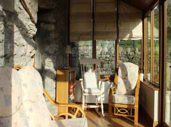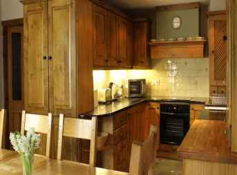 The entrance hall leads into the hub of the house - the dining kitchen - with an antique fireplace and large oak dining table seating 8. The 'cook's kitchen' features oak cupboards, black granite worktops and local slate floors and is very well equipped with induction hob, fan oven, Bosch dishwasher, fridge and good quality crockery. This leads into the oak conservatory with slate roof and central heating; a second lounge, it features a TV, books and games and a panoramic view of the garden.