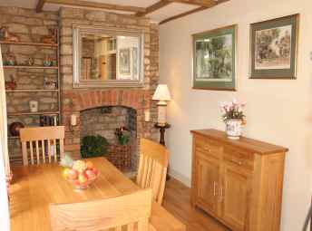 In the Dining room the exposed stone walls and open fireplace are complimented by oak beams and a large refectory table and 4 chairs. CD player, books, magazines and games.