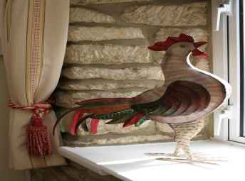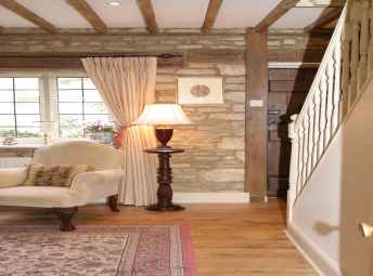 burning stove, stone mullion windows, exposed beams,