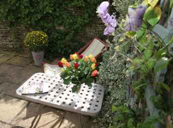 Stable door to private enclosed flower filled courtyard with deckchairs and patio set.