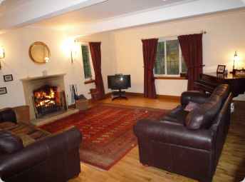 Spacious sitting room with: views to the lawn * open fire * luxurious leather settees * baby grand piano.