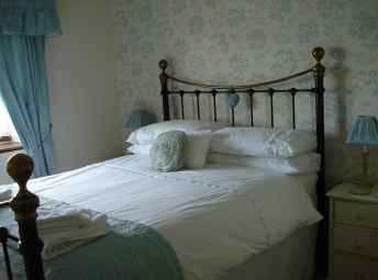 Bedroom - Double wrought iron bed with a comfortable mattress, Crisp white Laura Ashley bed linen, curtains and accessories. Double pine dressing table with mirror, two pine bedside cabinets. Fitted Wardrobe.
