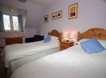 There are three bedrooms. The main bedroom has a king size bed and an ensuite bathroom with a shower and is situated on the ground floor. The second is a twin bedroom also situated on the ground floor and a bathroom with a bath next door which could be used as the 'family' bathroom. The third bedroom is on the first floor and also has twin beds and a bathroom with shower next door and could be classed as private as it is the only room being used upstairs. Bedding is supplied but not towels.